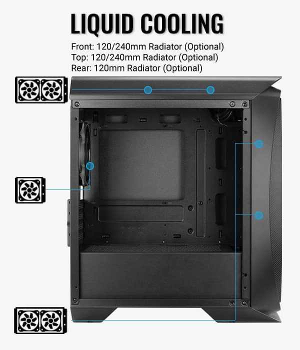 Liquid Cooling: Front: 120/240mm Radiator (Optional), Top: 120/240mm Radiator (Optional), Rear: 120mm Radiator (Optional)