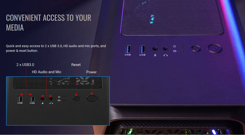 Στο επανω μερος βρισκονται τα κουμπια ελεγχου του υπολογιστη, οι θυρες των 3.5mm για HD Audio & Mic και 2 θυρες USB 3.0.