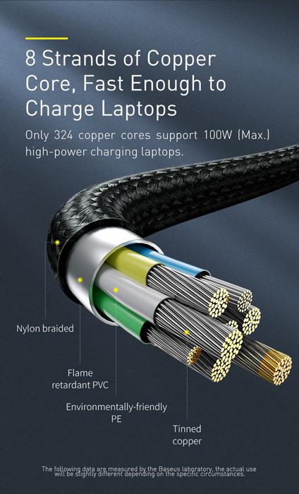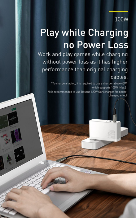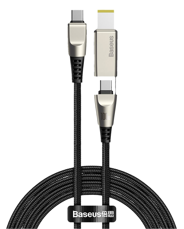 USB Type-C 2 σε 1 καλωδιο φορτισης και μεταφορας δεδομενων της Baseus, με μεταλλικα βυσματα και braided μονωση η οποια προσφερει αντοχη στον χρονο και μεγιστη προστασια του καλωδιου απο τσακισεις. Υποστηριζει φορτιση για smartphone συσκευες μεσω του βυσματος Type-C με μεγιστη αποδοση 5A και για laptops μεσω του ενσωματωμενου ανταπτορα DC (square head) με μεγιστη αποδοση 100W.