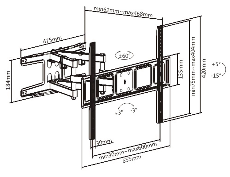 Metal Sheet Thickness: Wall Plate THK=2mm cold-rolled sheet, VESA Panel THK=1.8mm cold-rolled sheet, Bracket Arm THK=1.5mm cold-rolled sheet (Wall Plate THK=0.079" cold-rolled sheet, VESA Panel THK=0.071" cold-rolled sheet,Bracket Arm THK=0.059" cold-rolled sheet)