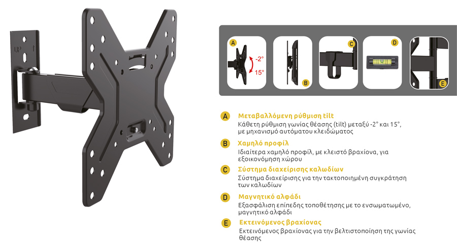 Καθετη ρυθμιση γωνιας θεασης (tilt) μεταξυ -2° και 15°, με μηχανισμο αυτοματου κλειδωματος