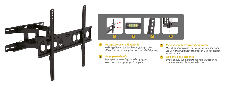 Μεταβαλλομενο πλατος βασης, με πολλες οπες, για μεγιστη συμβατοτητα σχεδον με ολες τις flat τηλεορασεις