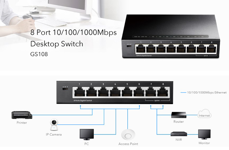 -8x 10/100/1000Mbps Auto-Negotiation, Auto-MDI/MDIX ports provide smart switching between 10Mbps, 100Mbps and 1000Mbps hardware