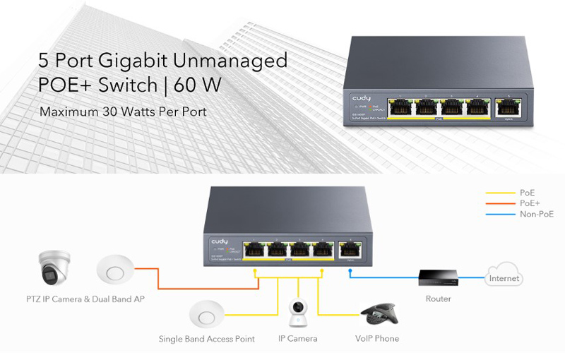 Το switch GS1005P απο την Cudy σας επιτρεπει να επεκτεινετε το δικτυο σας με 5 θυρες PoE+ με ταχυτητες 10/100/1000Mbps. Ειναι πληρως συμβατο με συσκευες PoE, οπως καμερες IP, access points, τηλεφωνα IP και καταγραφικα.