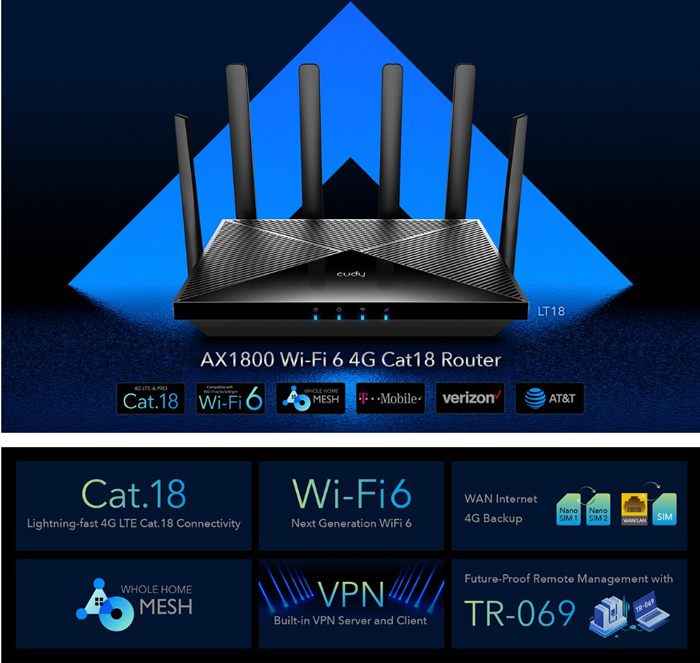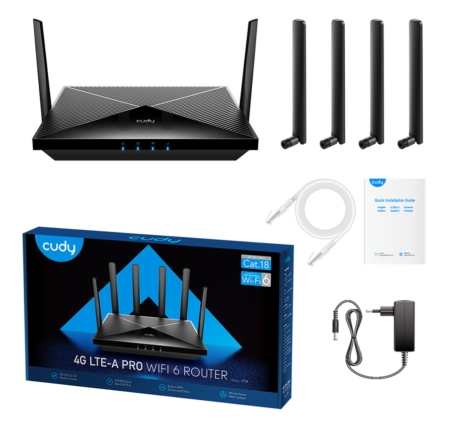 CUDY router LT18, 4G LTE Cat 18, 1200Mbps Wi-Fi 6, 4x Ethernet ports