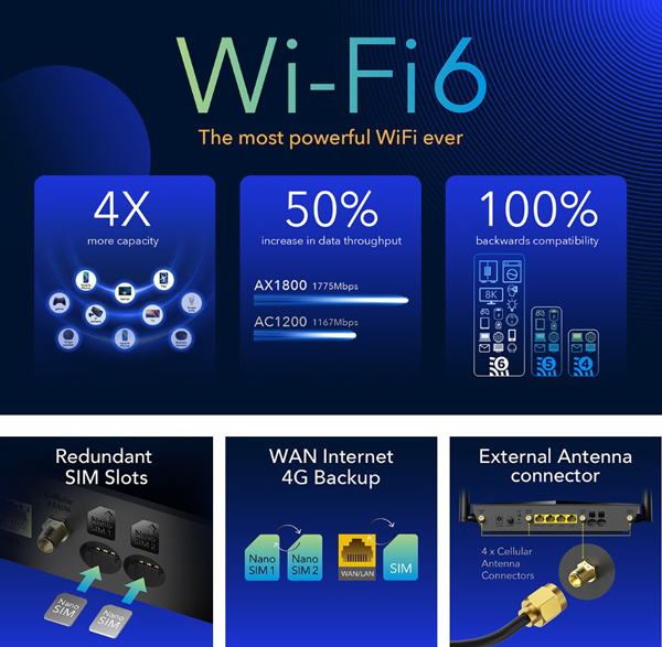 Interface: 4x GbE RJ45: 1 GbE WAN/LAN + 3 GbE LAN, 2x SIM Slots (Nano), 1x WPS Button, 1x Reset Button, 2x Fixed WiFi Antennas, 4x Detachable Cellular Antennas, LED indicators (Power, WiFi, Internet, Signal)