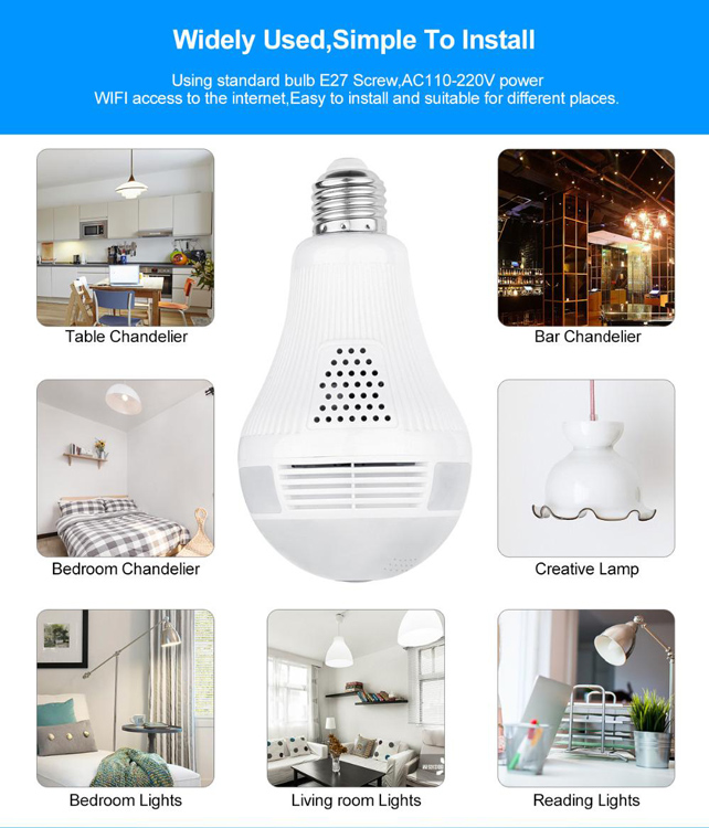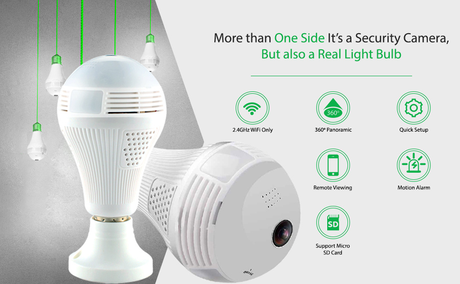 Λαμπα LED με ενσωματωμενη καμερα της Innotronic με δυνατοτητα πανοραμικης ληψης βιντεο και φωτογραφιας υψηλης αναλυσης 1080p καθως και την καταγραφη τους σε καρτα microSD η σε cloud. Υποστηριζει συνδεση με Wi-Fi και μπορει να συνδεθει με smartphone συσκευη απομακρυσμενα μεσω της εφαρμογης iCSee. Εχει δυνατοτητα νυχτερινης ληψης, ωστε να μπορειτε να καταγραψετε τη σκηνη ακομη και οταν δεν υπαρχει φωτισμος στο χωρο και ανιχνευτη κινησης. Επιπλεον διαθετει αμφιδρομη μεταφορα ηχου με noise cancelation.
