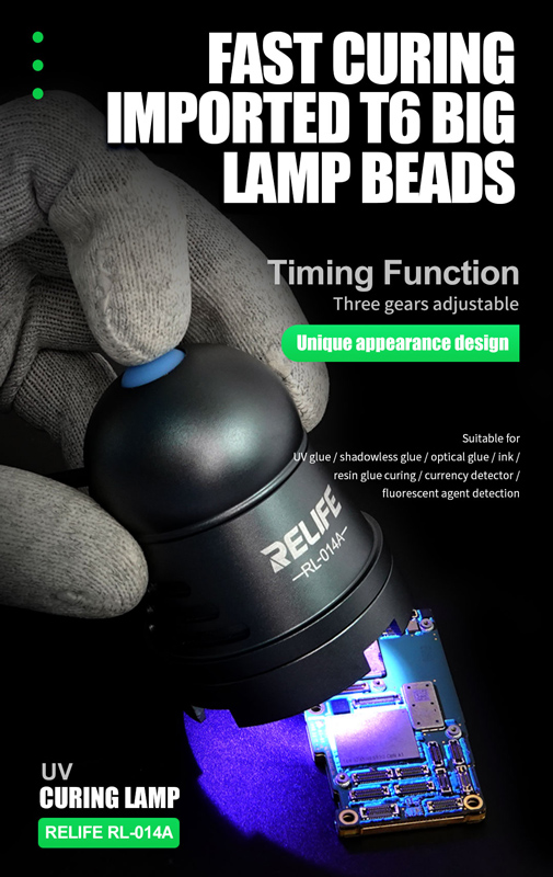 Λαμπα UV απο την Relife, καταλληλη για το στεγνωμα κολλας UV. Διαθετει 3 επιπεδα φωτεινοτητας και timing λειτουργια. Η τροφοδοσια του γινεται μεσω καλωδιου USB το οποιο ειναι ενσωματωμενο πανω στην λαμπα.