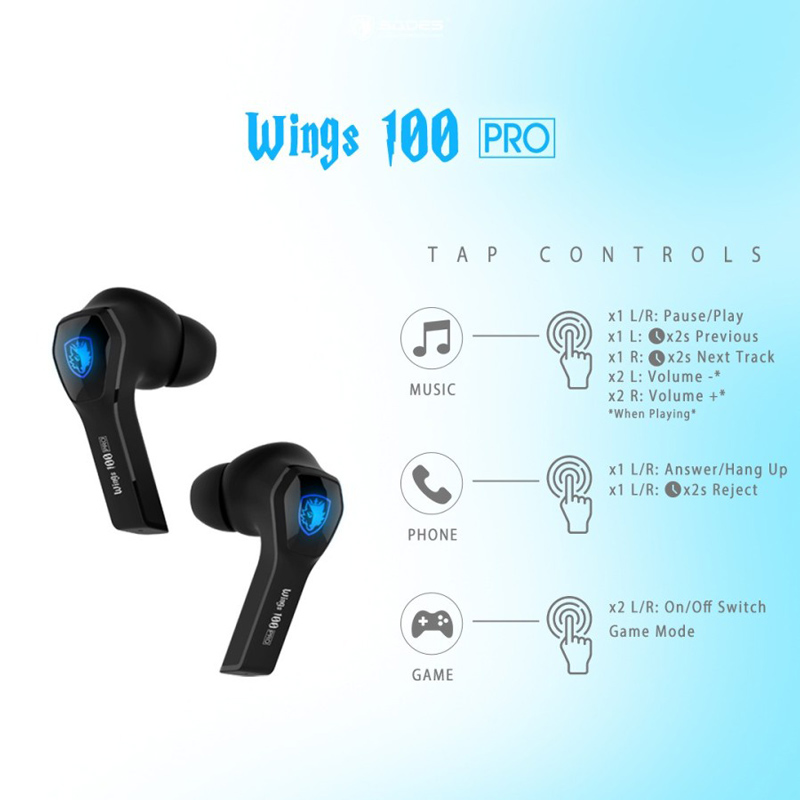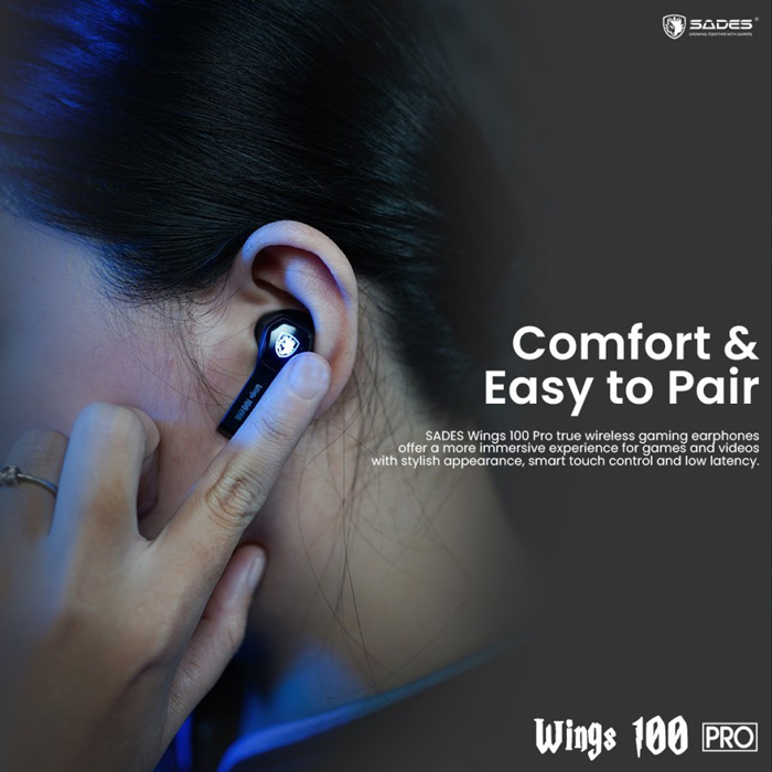 Τα True Wireless gaming earphones Wings 100 Pro της Sades προσφερουν κορυφαια ποιοτητα ηχου και αριστη εφαρμογη στο αυτι. Ειναι συμβατα με tablets, smartphones και καθε συσκευη που διαθετει bluetooth. Διαθετουν θηκη φορτισης, για την αποθηκευση, προστασια και επαναφορτιση των ακουστικων. Η θηκη επαναφορτιζεται απο οποιοδηποτε καλωδιο φορτισης USB-C.