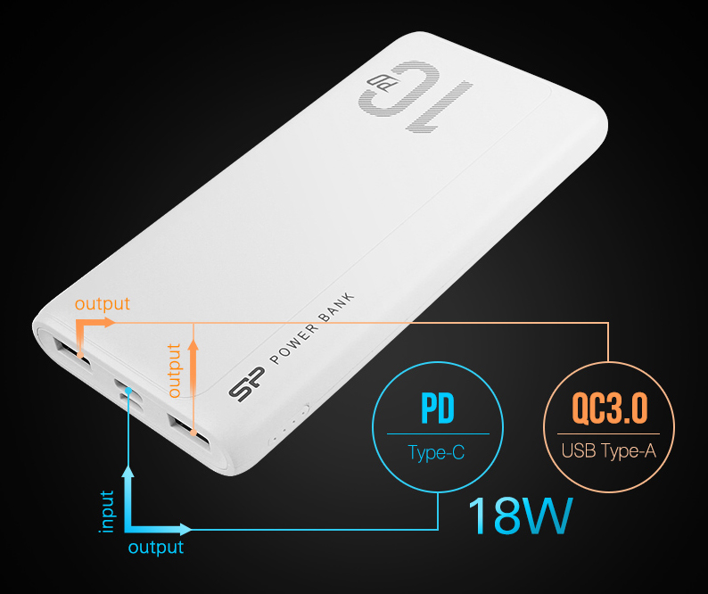Με το power bank QP15 της Silicon Power το αγχος της εξαντλημενης μπαταριας θα ειναι παρελθον. Η μπαταρια μεγαλης χωρητικοτητας 10.000mAh, ειναι σε θεση να φορτισει το smartphone σας η οποια αλλη συμβατη συσκευη, 2-4 φορες με μια μονο φορτιση. Διαθετει 2 θυρες εξοδου USB και 1 θυρα εξοδου/εισοδου USB Type-C (PD) με συνολικη αποδοση εως 3A. Επιπλεον, εξοπλιζεται με 4 LEDS indicators για την ενδειξη της μπαταριας και φορτιζει μεσω θυρας USB Type-C η Micro USB.