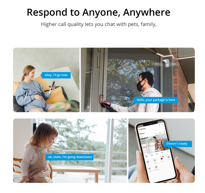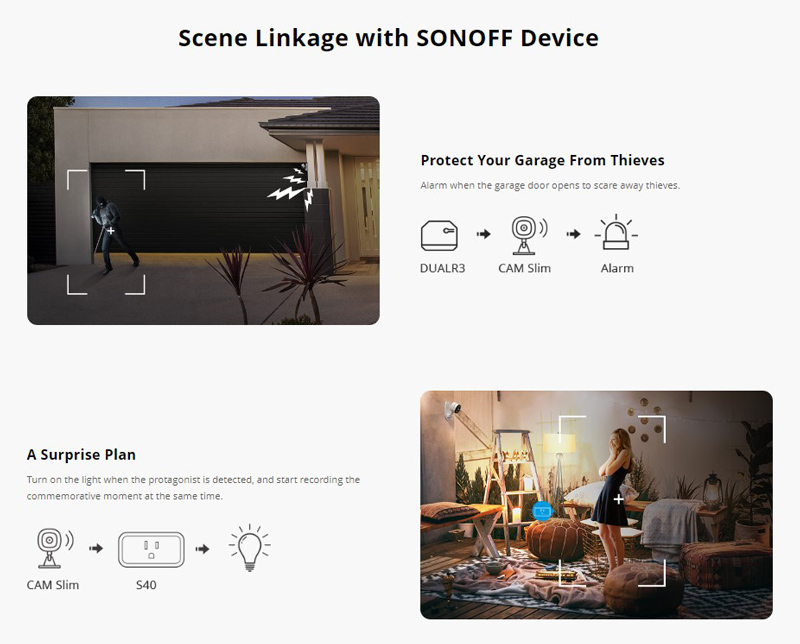 Ο ελεγχος της γινεται απομακρυσμενα απο smartphone μεσω Wi-Fi και της εφαρμογης eWeLink. Μπορει να εντοπιζει ανθρωπινη σιλουετα και κινηση και να ειδοποιησει τον ιδιοκτητη με push notifications απευθειας στο smartphone αλλα και να ενεργοποιει ηχητικο συναγερμο.