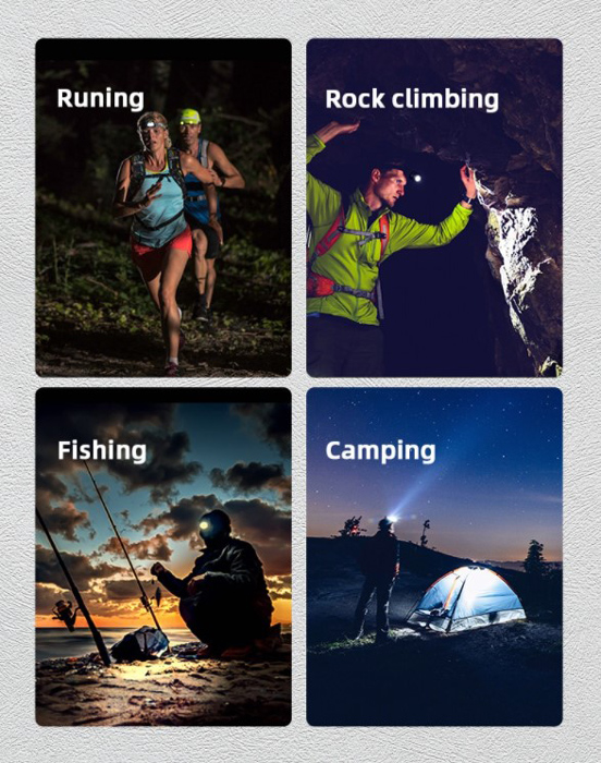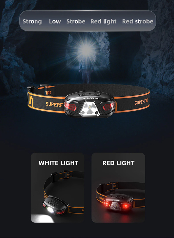 Φακος κεφαλης με αισθητηρα φωτος για αυτοματη λειτουργια και ρυθμιζομενη γωνια κλισης εως 60°. Διαθετει 5 modes, χαμηλη και δυνατη σκαλα λευκου φωτος, σταθερο και strobe κοκκινο φως και αυτοματη λειτουργια.