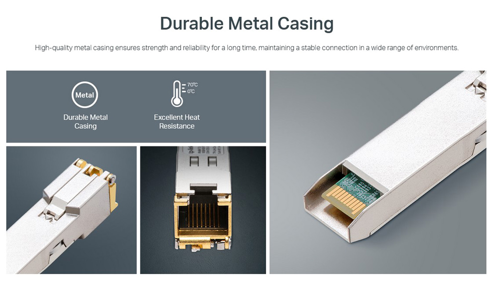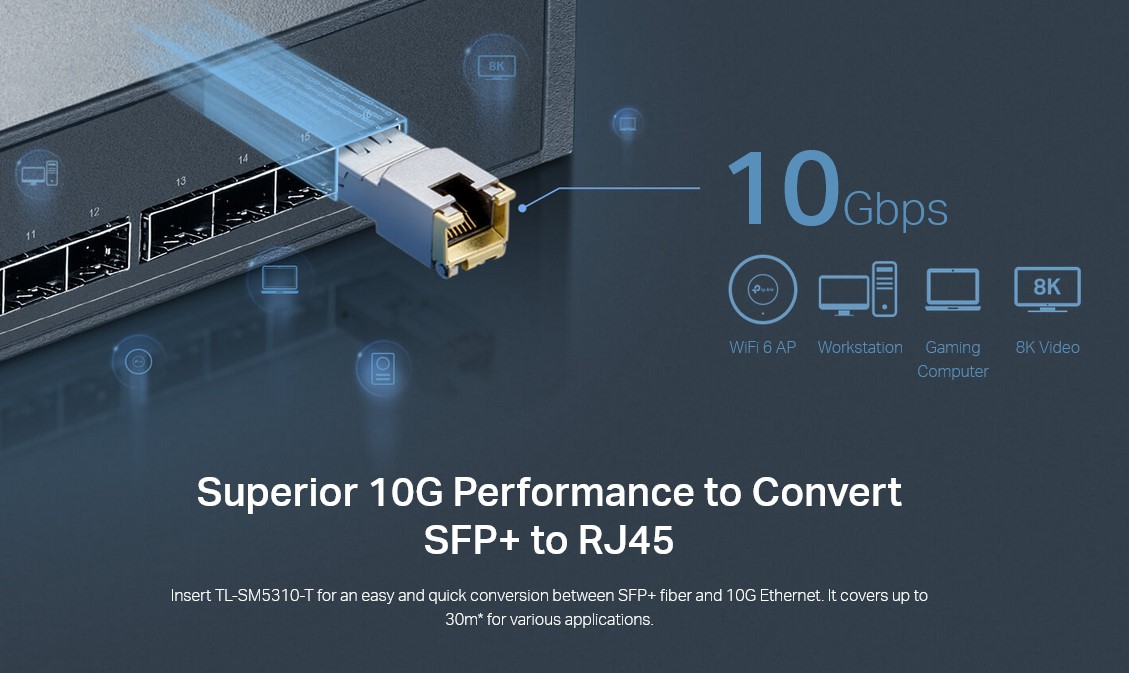 Το TL-SM5310-T παρεχει ανωτερη αποδοση 10G για ευκολη και γρηγορη συνδεση μεταξυ της διεπαφης SFP+ και της θυρας RJ45. Καλυπτει εως και 30m* στα 10 Gbps (UTP cat.6a η παραπανω) . Ο σχεδιασμος plug-and-play διευκολυνει την αναπτυξη, χωρις να χρειαζεται τεχνικος. Το υψηλης ποιοτητας μεταλλικο περιβλημα εξασφαλιζει αντοχη και αξιοπιστια για μεγαλο χρονικο διαστημα, διατηρωντας μια σταθερη συνδεση σε ενα ευρυ φασμα περιβαλλοντων.