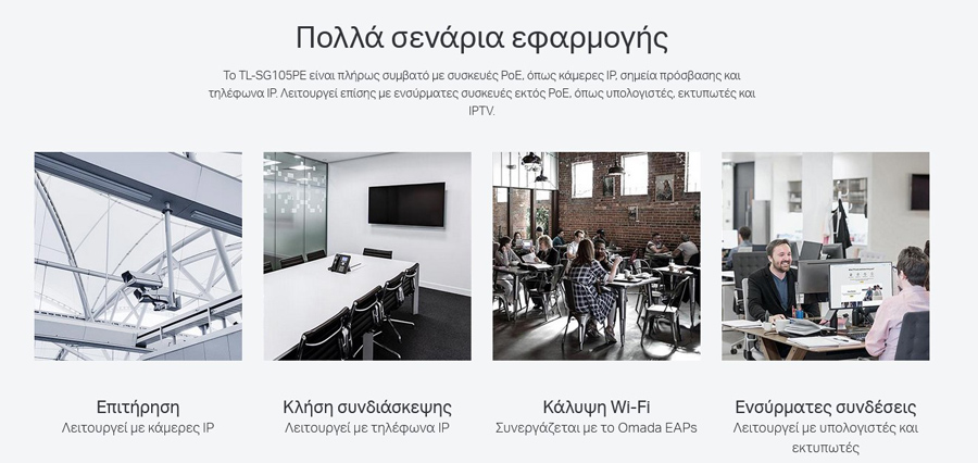 Το TL-SG105PE ειναι ενα επαγγελματικο Gigabit Easy Smart Switch 5-θυρων με PoE + 4 θυρων, πληρως συμβατο με συσκευες PoE, οπως καμερες IP, σημεια προσβασης και τηλεφωνα IP. Λειτουργει επισης με ενσυρματες συσκευες εκτος PoE, οπως υπολογιστες, εκτυπωτες και IPTV.