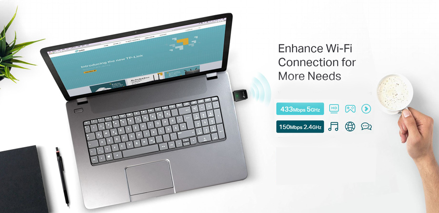 Το Archer T2U λαμβανει σηματα Wi-Fi σε δυο ξεχωριστες ζωνες. Η υποστηριξη της τεχνολογιας 256QAM αυξανει το ρυθμο δεδομενων 2.4GHz απο 150Mbps σε 200Mbps για 33% ταχυτερη αποδοση.