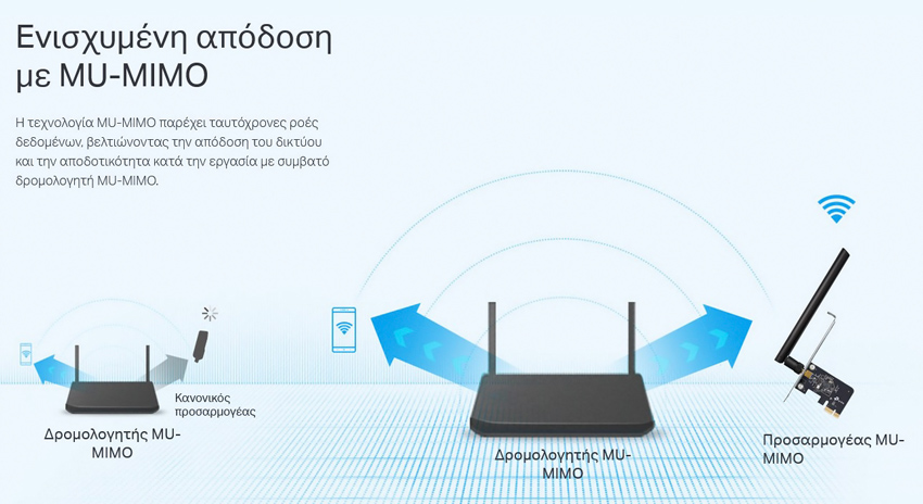 -Υποστηριζεται MU-MIMO-Ενισχυστε την αποδοση και την αποδοτικοτητα του δικτυου οταν εργαζεστε με συμβατο δρομολογητη MU-MIMO